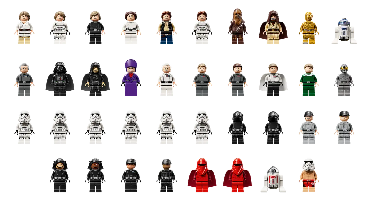 - Minifiguras: nada menos que 38 personajes, incluidos Luke Skywalker (dos versiones), Han Solo (dos versiones), Leia, Chewbacca, Darth Vader, Obi-Wan Kenobi y el Emperador Palpatine, además de droides icónicos.